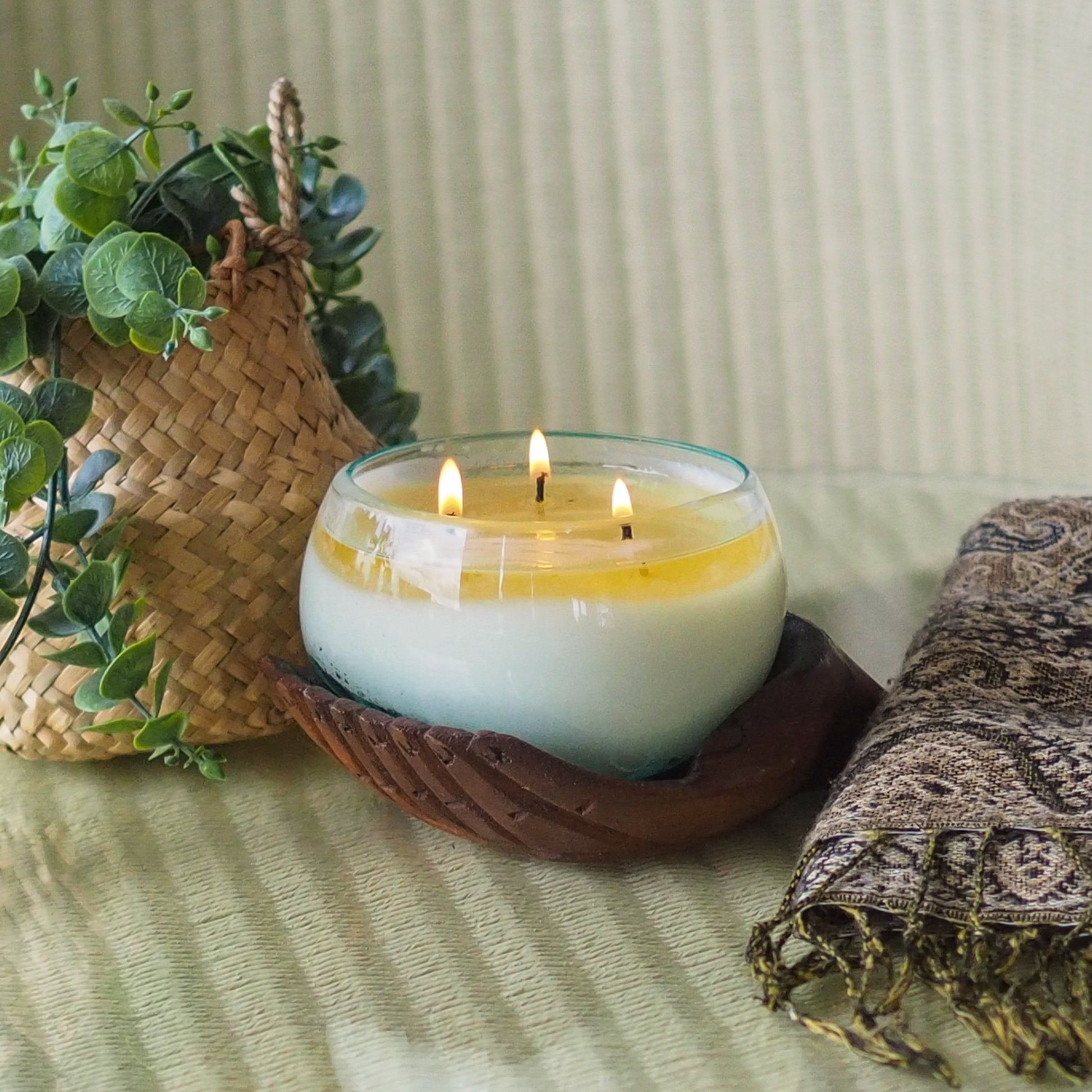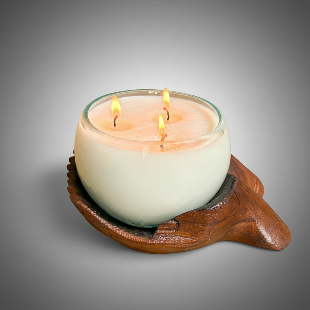 A true statement candle, the Teak Hands pairs hand-blown glass with a natural teak base that cradles the vessel like sculpted hands. Each piece is one of a kind, showcasing the organic shapes and textures of reclaimed teak.